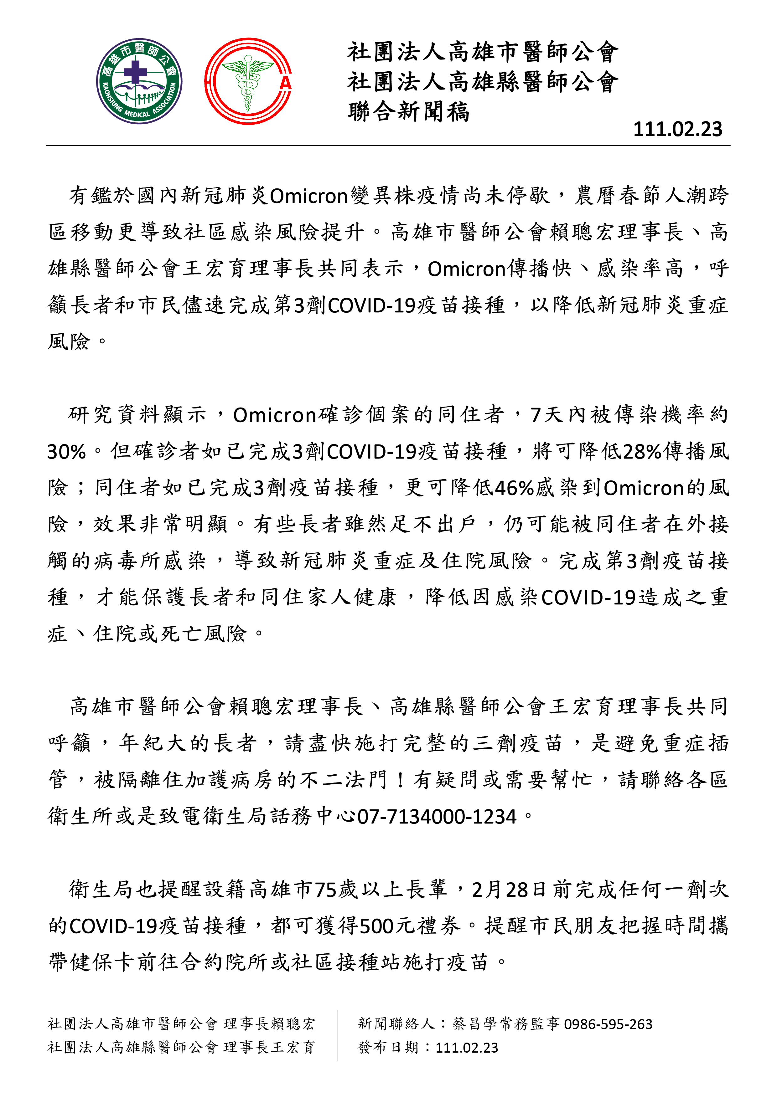 111.02.23【社團法人高雄市(縣)醫師公會聯合新聞稿】