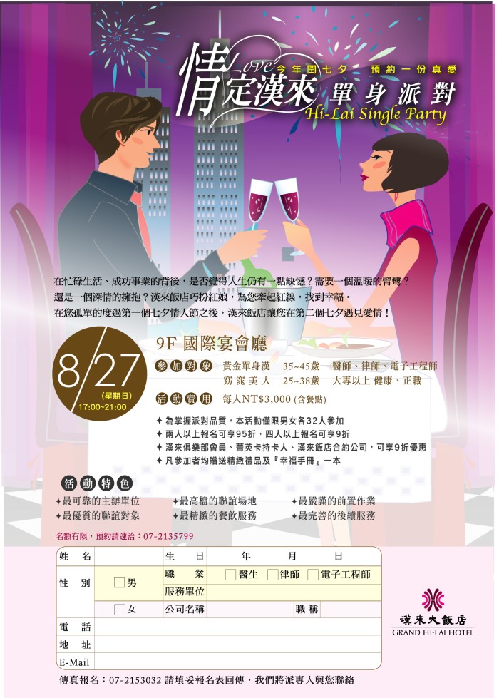 轉知漢來大飯店舉辦「情定漢來單身派對」,活動參加對象為未婚之醫師、律師、電子工程師,未婚會員如有興趣可自行填妥報名表參加。